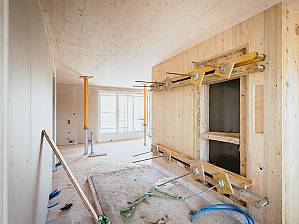 Ein zentraler bautechnischer Aspekt war die Optimierung der Bauzeit, da sich das Baufeld des Ersatzneubau in einem ruhigen und dichtbebauten Wohnquartier befindet. Während normalerweise das Treppenhaus vor dem Holzbau errichtet wird und dabei mehrere Wochen Verzögerung entstehen, wurde hier ein neuartiger Ablauf gewählt: Holzbau und Betonarbeiten liefen parallel im Stock-für-Stock-Prinzip. Diese enge Zusammenarbeit zwischen Holzbauer und Baumeister ermöglichte eine saubere Integration der Materialien, reduzierte die Komplexität an den Schnittstellen und sparte insgesamt rund drei Monate Bauzeit – ein entscheidender Vorteil für die Wirtschaftlichkeit und Termintreue des Projekts.
