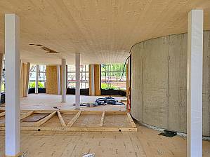 Die Bauweise ein reiner TS3-Skelettbau, mit Brettsperrholzplatten und Stützen die leicht schräg gestellt werden, unterstützen das Raumkonzept der Bibliothek.