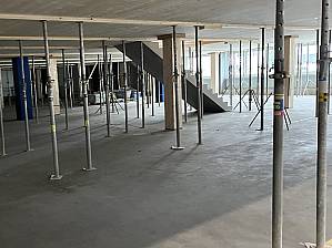 280mm CLT Platten wurden auf Holzstützen gesetzt und mit der TS3-Technologie biegesteif verbunden, somit eine reine Stützen-Platten-Konstruktion. Das Stützenraster von 6.3m x 5.5m bietet einen flexiblen Grundriss für eine spätere Umnutzung und optimalen Platz für die Regale