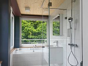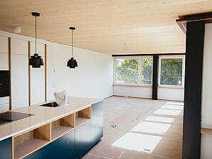 Das Gebiet des Quartier Riesbach oberhalb des Bahnhof Tiefenbrunnen ist geprägt durch weitläufige Gärten mit altem Baumbestand. Das Projekt sieht vor das bestehende Zweifamilienhaus aus den 20er Jahren durch ein Mehrfamilienhaus mit sieben Einheiten zu ersetzen. Der Bau wird mit einem Stützen- Plattensystem in reiner Holzbauweise erstellt. Bandfenster ermöglichen gleichzeitig einen uneingeschränkten Blick in die begrünte Umgebung und bieten über die geschlossenen Brüstungen genügend Behaglichkeit. Die sichtbaren, hölzernen Decken verstärken die Horizontalität der Raumgefüge. Massive, grobkörnige Nagelfluh- Steinböden «erden» die Räume und geben einen interessanten Kontrast zum Holzbau.