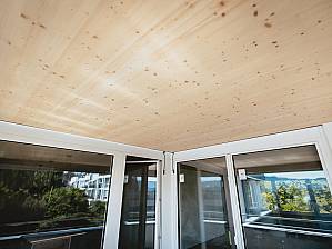 Der Neubau basiert auf einer reinen TS3-Skelettbauweise mit punktgestützten Flachdecken – komplett ohne Unterzüge. Die Decken aus durchlaufenden CLT-Platten verbinden Innen- und Außenräume optisch wie konstruktiv. Balkone und Wohnräume gehen fugenlos ineinander über – eine Schlüsselqualität des TS3-Systems. Die Bandfenster betonen die Offenheit und sorgen für Licht, Sicht und Luftigkeit – unterstützt durch die filigrane Tragstruktur aus dem TS3-Giessharz-Verbundsystem.