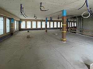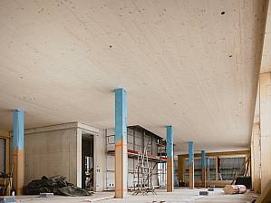 Der Neubau der Raiffeisenbank Wasserschloss in Gebenstorf, entworfen von Merlo Architekten AG, setzt auf die TS3-Skelettbauweise: Stützen und weit gespannte, punktgestützte Brettsperrholzplatten bilden die Tragstruktur, so dass umlaufende Bandfenster ein offenes und helles Ambiente eröffnen. Die weitgespannte Tragstruktur ermöglicht eine flexible Raumgestaltung für die Schalterhalle und die darüberliegenden Büroflächen, welche sich auf die weiteren 3 Geschosse verteilen.