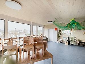 The existing kindergarten was extended for capacity reasons. The winning project by Matthias Glutz architects was chosen for its sustainable construction and innovative approach. The existing load-bearing structure was used selectively. Thanks to TS3, the cross-laminated timber ceiling and roof construction could be planned and realized as a skeleton structure. The additional cantilever at the rear of the building was also elegantly implemented.