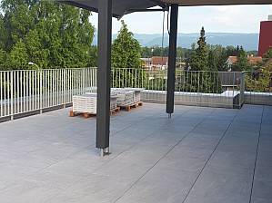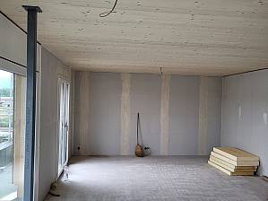 Les murs extérieurs sont en ossature bois. Les murs intérieurs ne sont pas porteurs, sauf ceux séparant les appartements. Le toit plat utilise le système TS3 avec des panneaux CLT, soutenu uniquement par des piliers à l’intérieur. Les plafonds TS3 couvrent les terrasses sans interruption, du chaud au froid. Selon le souhait du client, le plafond d’un appartement est recouvert de plaques de plâtre et enduit, tandis que dans l’autre, le CLT reste visible.