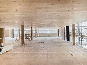 Des panneaux CLT de 280 mm ont été fixés rigidement sur des poteaux en bois avec la technologie TS3, formant une structure simple de poteaux et panneaux. La disposition des poteaux (6,3 m x 5,5 m) permet un plan d'étage flexible, adaptable pour une réutilisation future et optimisé pour des rayonnages.