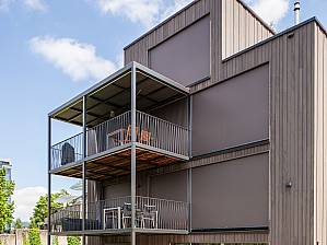 Alors que les éléments des murs extérieurs ont été réalisés en ossature bois classique avec des renforcements locaux et un bardage ventilé, les planchers ont été construits grâce à la technologie révolutionnaire Timber Structures 3.0. Cette technologie permet de coller les éléments en bois sur leurs extrémités, ce qui crée un plancher très fin et parfaitement plat. La planification est simplifiée, et la pose est rapide et économique. En supprimant le béton coulé sur place, le plancher est immédiatement sec et prêt à supporter des charges. Le bâtiment a été construit début février 2015 et a été prêt à être occupé cinq mois plus tard, en juillet 2015.
