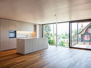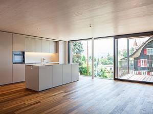 Dans le quartier résidentiel de Lauenen, à Thoune, un immeuble de quatre étages en éléments de bois est en cours de construction.
