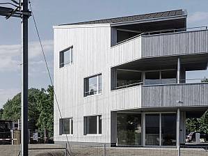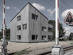 Die Vorteile der Holzbauweise sind deutlich sicht- und spürbar: In nur gerade einer Woche wurde das stattliche Gebäude aufgerichtet. Die sehr kurze Bauzeit ermöglichte den Verzicht von aufwendigen Sicherungsmassnahmen entlang der Bahngleise. Im Inneren bieten die farblos lasierten Holzdecken eine angenehme Wohnatmosphäre. Aussen strahlt der Holzbau mit einer hinterlüfteten, silbergrau pigmentierten Holzschalung. Die zurückhaltende Farbgebung verleiht dem Neubau einen zeitgemässen, architektonischen Ausdruck und schafft Assoziationen zum traditionellen Holzbau.