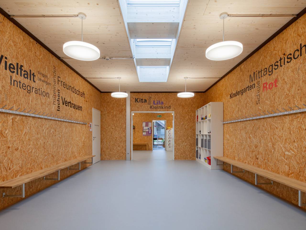 Durch die sorgfältige Planung und Konzeption des Gebäudes können Umnutzungen, Erweiterungen und sogar eine Aufstockung mit identischem Grundriss problemlos realisiert werden. Die Verwendung der 210 mm starken CLT-Platten verleiht dem Gebäude eine natürliche und warme Atmosphäre. Gleichzeitig wurden die CLT-Platten ab Werk mit einem farblosen UV-Schutzanstrich behandelt, um ein deutliches Abdunkeln des Holzes im Innenbereich zu verhindern.