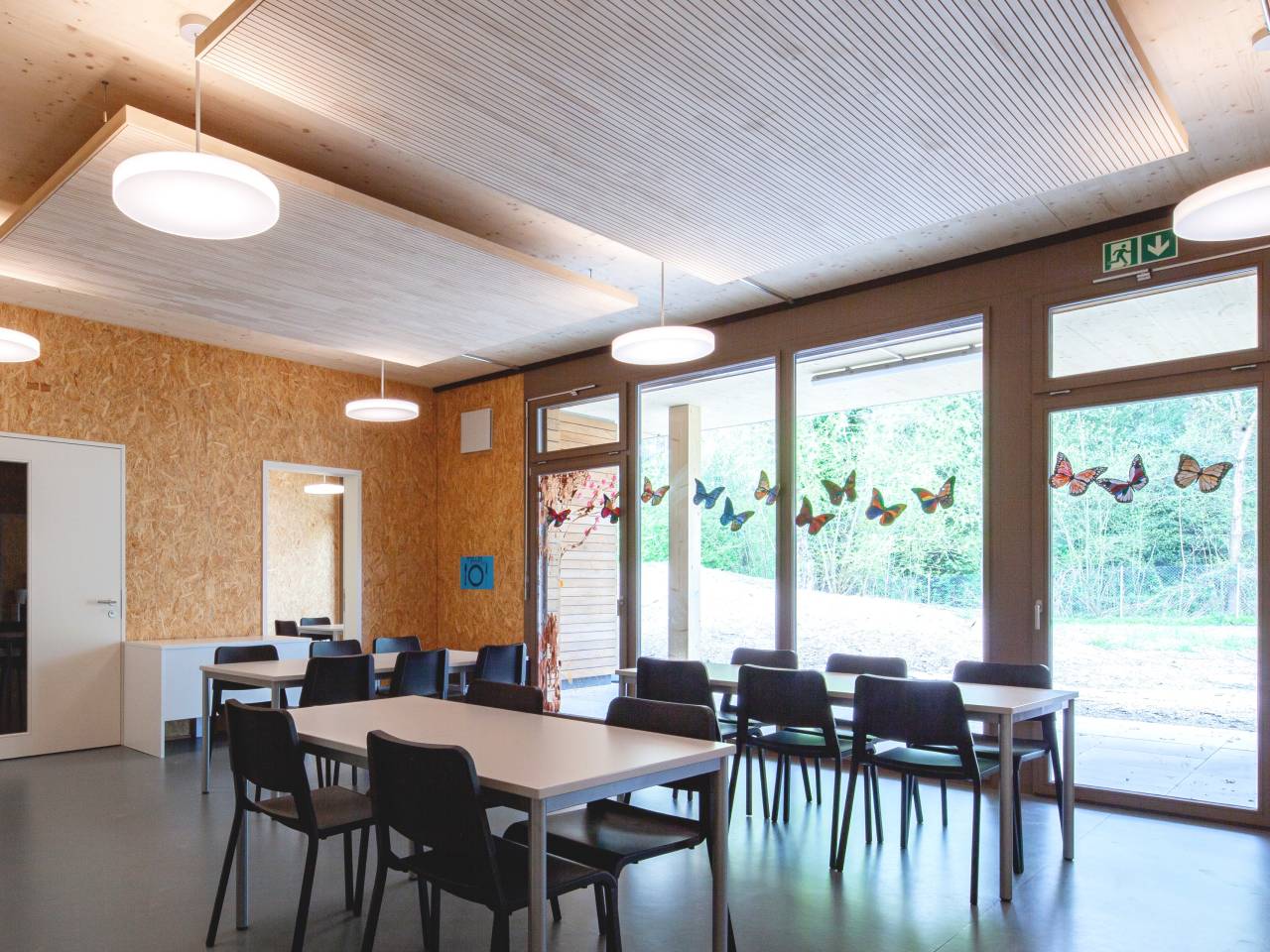 Die TS3-Flachdecke ermöglicht nicht nur eine effiziente und nachhaltige Bauweise, sondern auch eine ästhetisch ansprechende Gestaltung. Grosse Fensterfronten sorgen für helle und lichtdurchflutete Räume, während die hinterlüftete Fassade mit horizontaler Verkleidung aus sägerohen, geölten Tannenbrettern für einen harmonischen Gesamteindruck sorgt.