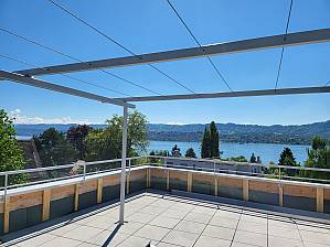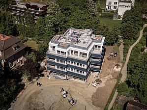 Das Gebiet des Quartier Riesbach oberhalb des Bahnhof Tiefenbrunnen ist geprägt durch weitläufige Gärten mit altem Baumbestand. Das Projekt sieht vor das bestehende Zweifamilienhaus aus den 20er Jahren durch ein Mehrfamilienhaus mit sieben Einheiten zu ersetzen. Der Bau wird mit einem Stützen- Plattensystem in reiner Holzbauweise erstellt. Bandfenster ermöglichen gleichzeitig einen uneingeschränkten Blick in die begrünte Umgebung und bieten über die geschlossenen Brüstungen genügend Behaglichkeit. Die sichtbaren, hölzernen Decken verstärken die Horizontalität der Raumgefüge. Massive, grobkörnige Nagelfluh- Steinböden «erden» die Räume und geben einen interessanten Kontrast zum Holzbau.