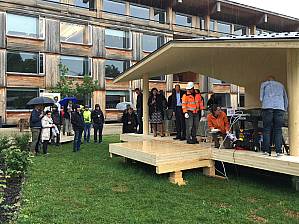 Supports, panels, done: In the courtyard of the Bern University of Applied Sciences in Biel, there is a permanent test stand with the new TS3 technology and the world's first face-bonded balcony. This clearly demonstrates the new possibilities for timber construction.