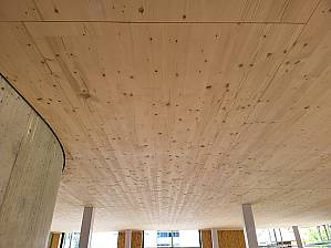 The construction method - a pure TS3 skeleton structure with cross-laminated timber panels and slightly inclined columns - supports the library's spatial concept.