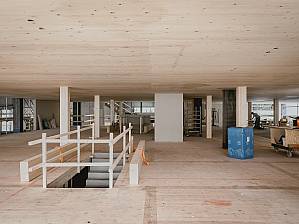 Des panneaux CLT de 280 mm ont été fixés rigidement sur des poteaux en bois avec la technologie TS3, formant une structure simple de poteaux et panneaux. La disposition des poteaux (6,3 m x 5,5 m) permet un plan d'étage flexible, adaptable pour une réutilisation future et optimisé pour des rayonnages.