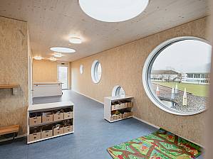 L’agrandissement de l’école maternelle a été fait pour augmenter sa capacité. Le projet du cabinet Matthias Glutz a été choisi pour sa durabilité et ses solutions innovantes. La structure existante a été utilisée ponctuellement. Grâce à la technologie TS3, le plafond et le toit en bois lamellé-collé ont été construits sous forme d'ossature. Le porte-à-faux à l'arrière a aussi été réalisé de manière élégante.
