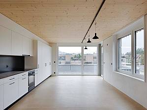 Le nouveau bâtiment au 52 Wehntalerstrasse à Zurich-Unterstrass compte huit appartements de tailles variées. La maison intergénérationnelle W52 met l'accent sur l'écologie et la durabilité, avec des plafonds en TS3.
